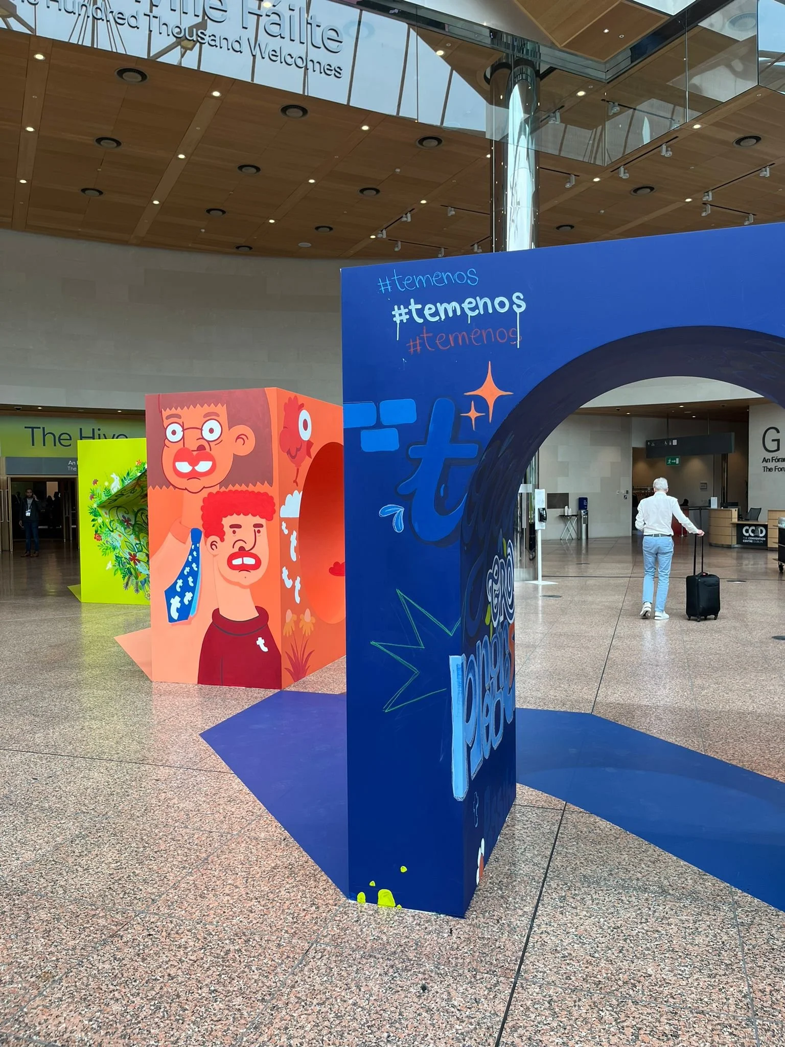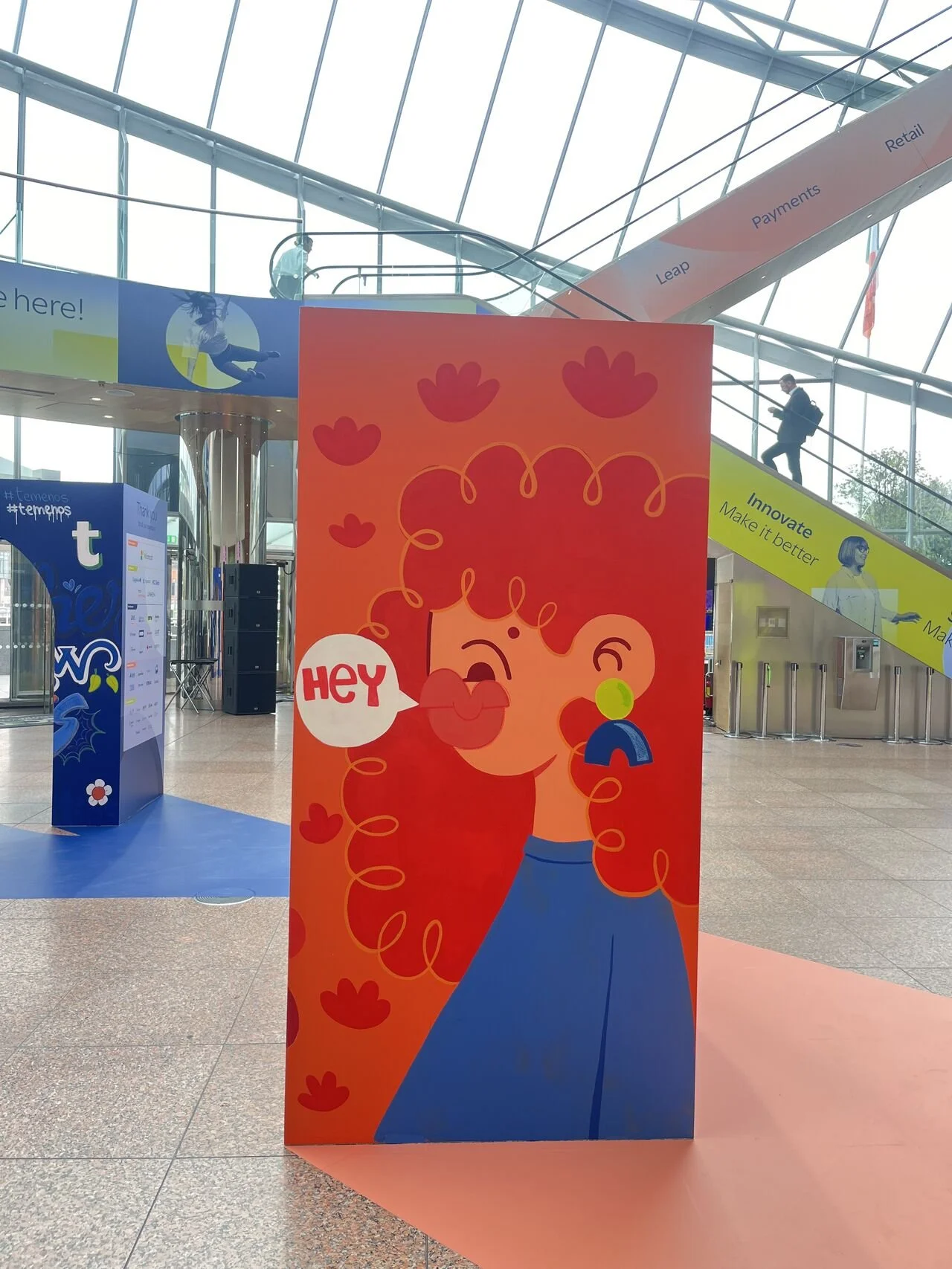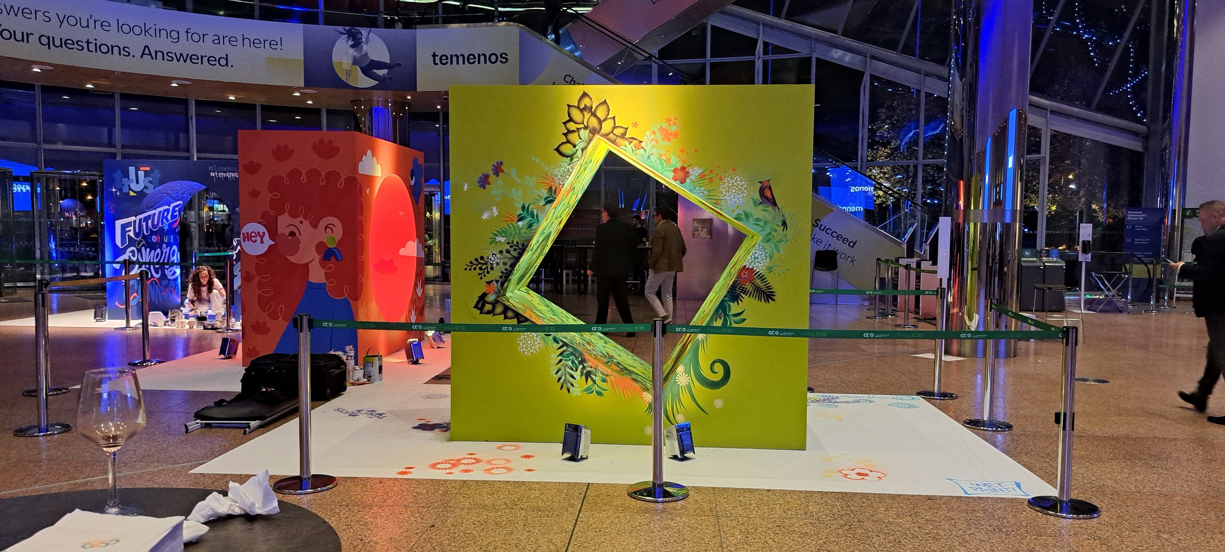 This live painting project was created as part of the Temenos Community Forum, a major global banking technology conference exploring innovation across SaaS, cloud, AI and digital finance. Working in collaboration with Ivory Worldwide, we created a series of large-scale installation pieces positioned in the main entrance foyer, a busy, high-energy space I’d only ever experienced before as part of the crowd.